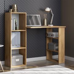 Компактный компьютерный стол «СТК 1» со столешницей размером 822*493 мм. С одной стороны столешница опирается на открытый стеллаж размером 150*734*460 мм с двумя полками. С другой стороны столешница пристыковывается к открытому пеналу размером 328*1026*296 мм также с двумя полками.