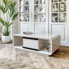 Большой журнальный стол с двумя выдвижными ящиками. Цвет стола: светло-серый, теплого оттенка Grey beige (серый беж). Ручки ящиков изготовлены из бука, покрытого лаком "темный орех". На фасадах ящиков и боковых стенках имеется элегантный декор в виде горизонтальных линий. Размеры ящиков: 500х350хh140 мм.