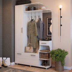 Состоит из: шкафа с полками, вешалки с крючками для одежды и сумок, обувницы, открытых полок, зеркала, полки для головных уборов, выдвижного ящика. Сборка универсальная, рисунок на фасадах универсальный.