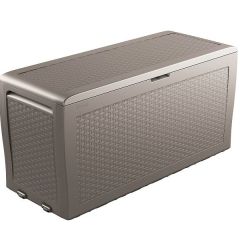 Самоа - превосходный сундук для подушек и садовых аксессуаров. Крепкий и прочный ящик. Полностью устойчив к погодным условиям и ультрафиолетовому излучению. Ящик изготовлен из пластика, поэтому он не нуждается в уходе. Встроенные ручки и ролики упрощают перемещение. Легкий и быстрый монтаж – без помощи инструментов. Закрывается на замок (замок не прилагается). Красивое ротанговое плетение. Эстетичный вид – хорошая цена.