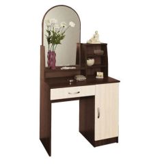 Туалетный стол «Надежда-М09» – эстетичный и функциональный предмет интерьера, создающий для пользователя необходимые условия для поддержания красивого внешнего облика. Зеркало полуовальной формы располагается справа, слева выполнена конструкция с открытыми полками для размещения флаконов с парфюмерией, сувениров, статуэток и т. п. Выдвижной ящик и секция с распашными створками позволяют хранить множество полезных вещей. Свободная ниша слева позволяет удобно располагаться человеку непосредственно перед зеркалом в положении сидя.